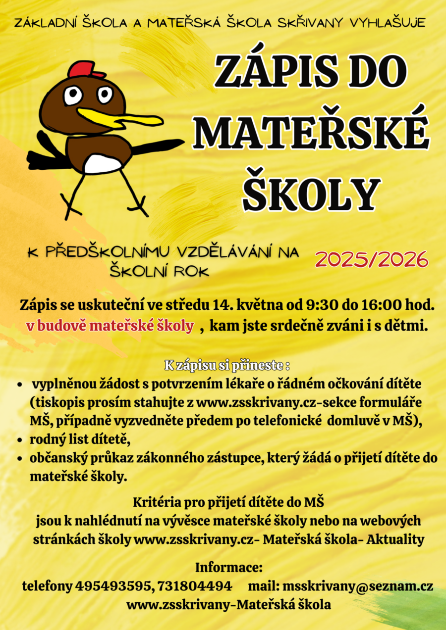Úvod > Obec > Aktuality > Zápis do mateřské školy ve Skřivanech